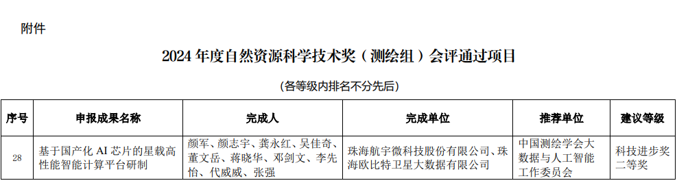 近日,2024年度自然资源科学技术奖评选结果正式公布。珠海航宇微科技股份有限公司与全资子公司珠海欧比特卫星大数据有限公司联合完成的“基于国产化AI芯片的星载高性能智能计算平台研制”项目脱颖而出,荣获测绘组“科技进步奖二等奖”